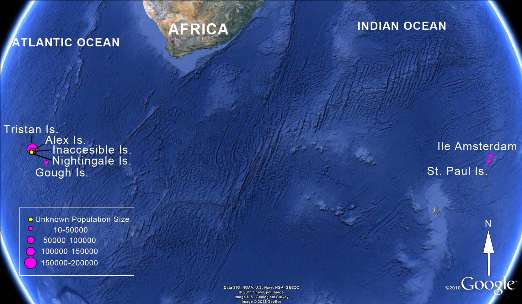 Tristan da Cunha islands and Gough Island in the central South Atlantic Ocean and at Amsterdam and St Paul Islands in the Indian Ocean. Migratory after breeding and moulting.